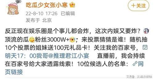 张小寒,一个在娱乐圈里小有名气的博主,她的爆料向来都是真实可信,让人信服。这次,她又是从哪个角落里挖出了惊天动地的秘密呢?让我们一起来看看吧!